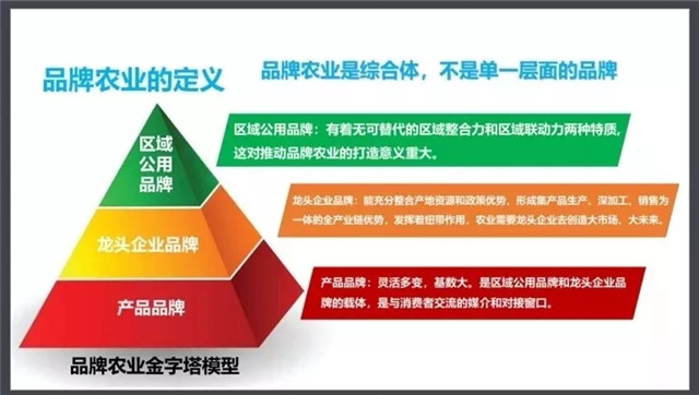 李志起表示,做好品牌农业,并非一朝一夕,而是系统性工程。品牌农业是综合体,不是单一层面的品牌。品牌农业应是由区域公用品牌、龙头企业品牌和产业品牌组成的由上至下的三级金字塔。